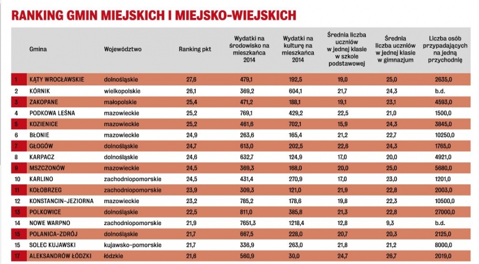 Na podstawie sprawozdań finansowych oraz odpowiedzi na rozesłane ankiety tygodnik "Wprost" wytypował najlepsze gminy do życia. Analizując zebrane dane, można pokusić się o stwierdzenie, że w polskich gminach poprawia się jakość życia. Rosną wydatki na ochronę środowiska i kulturę.