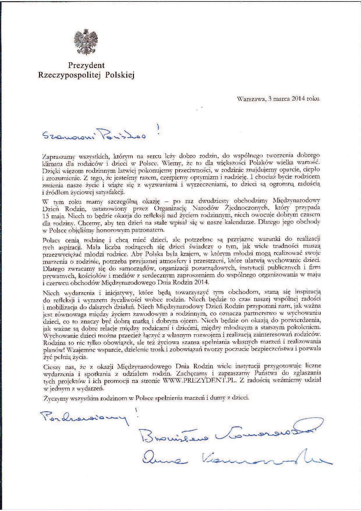 Z okazji XX Międzynarodowego Dnia Rodzin (15 maja 2014) Prezydent Bronisław Komorowski wraz z Małżonką wystosowali listdo wszystkich, którym na sercu leży dobro rodzin. Zachęcamy do zapoznania się z jego treścią.